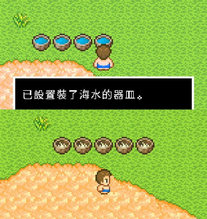 在海邊使用椰子殼碗則能取得「海水」,裝海水的碗可以放在地上,過4小時後就會變成「鹽巴」,鹽巴能觸發的研究跟主線有關的是「除鏽劑」(鹽+檸檬汁)。