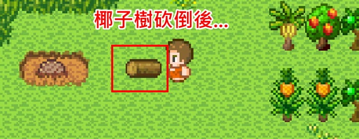 使用斧頭砍椰子樹,會得到「粗圓木」,這也是主線必備道具。