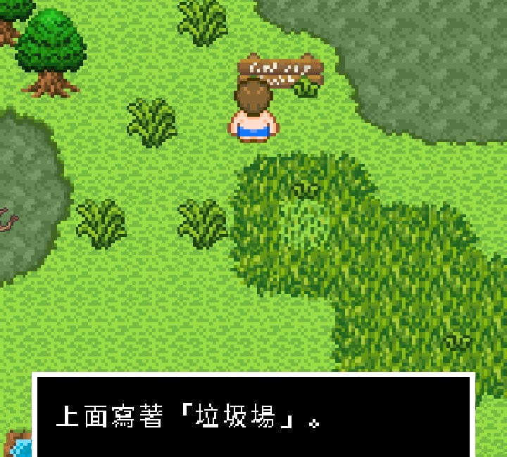 入口處有塊木牌,把毒草割掉後可以得知這裡是「垃圾場」,這邊有很多很實用且主線劇情必須用到的垃圾廢棄物。