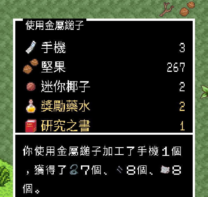 | 攻略 | 1.樹枝篇 2.椰木篇 3.貝殼杉木篇 4.柚木篇 5.金屬鎚子 6.最強工具 7.修理小船 8.隱藏劇情 | 製作電鑽 |