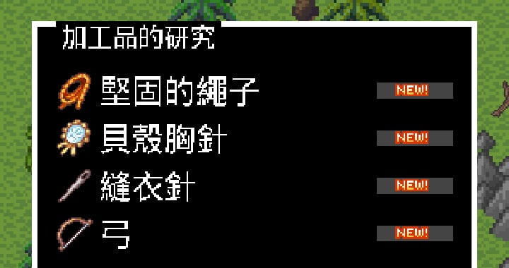 拿到「金屬板」後可以研究「小型小刀」,這很重要,製作出小型小刀後,會觸發「堅固的繩子」、「縫衣針」跟「弓」的研究,在這之前就算已得到「堅固的繩子」跟「弓」的所需材料也無法觸發研究。