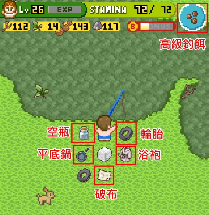 完成「沼地釣竿」後,接下來目標是在沼澤釣到接下來需要的一些物品,用「高級釣餌」就足夠,像是: