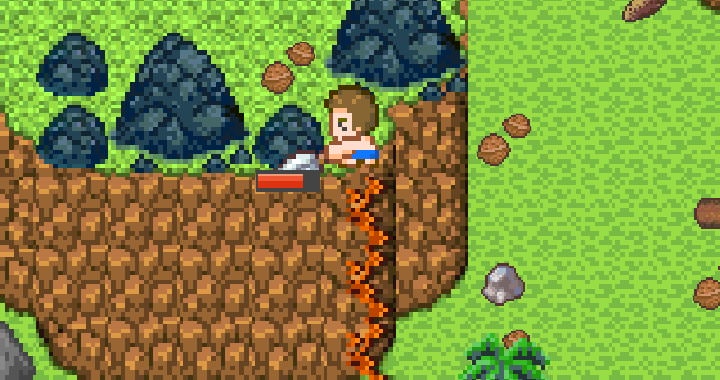 製作好「大型鏟子」後,峭壁上多處都有這種黑色土堆,若要用「大型鏟子」硬挖得挖超過100下,也是可以硬挖,但建議不用這麼早挖,遊戲設計一個挖不動的土堆在那,就是希望玩家先往別的方向探索。