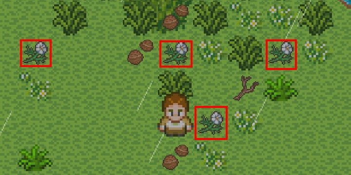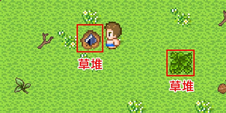 一般面對草堆點動作鍵,都是取得「木薯」,但這個草堆底下有埋東西,這算是規則宣告,若沒有看攻略,在探險時需要做較為詳細的搜查,尤其是這類草堆常藏有關鍵物品(毒草也是,但得等製作出割草武器)。