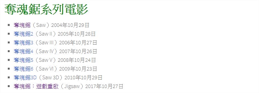 像我以前在文末附的連結是長這樣,後來改用 WordPress 架站後才發現這樣一行就算一個段落(語法<p>),若是用Google AdSense 的自動廣告,就會被亂塞廣告,因為程式會認為上圖這段有9個段落,可能奪魂鋸2跟奪魂鋸3中間塞一顆廣告、奪魂鋸5跟奪魂鋸6中間又塞一顆廣告,末端又塞一顆廣告。