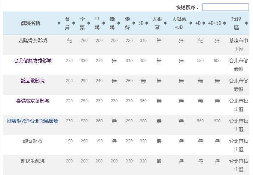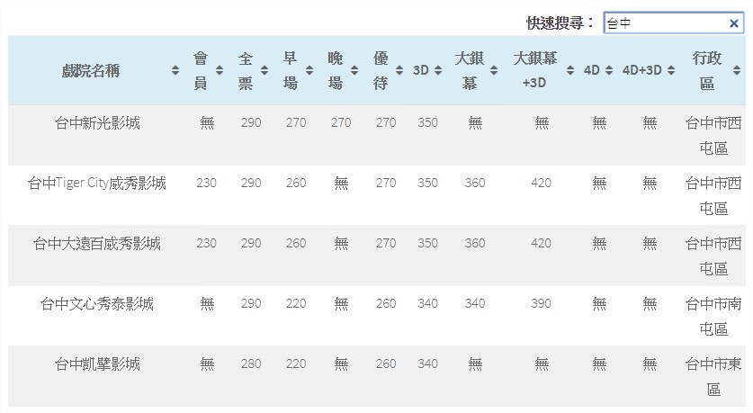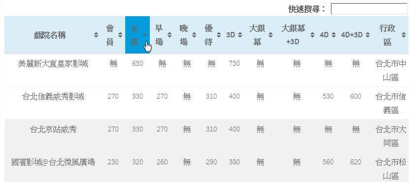 點表格的某欄,它就會依照數值大小(或文字)去排列資料,像我這篇用來整理全台電影院票價,有這功能就很好用。您也可以實際操作看看:台灣電影院票價比較 [附搜尋排序功能]