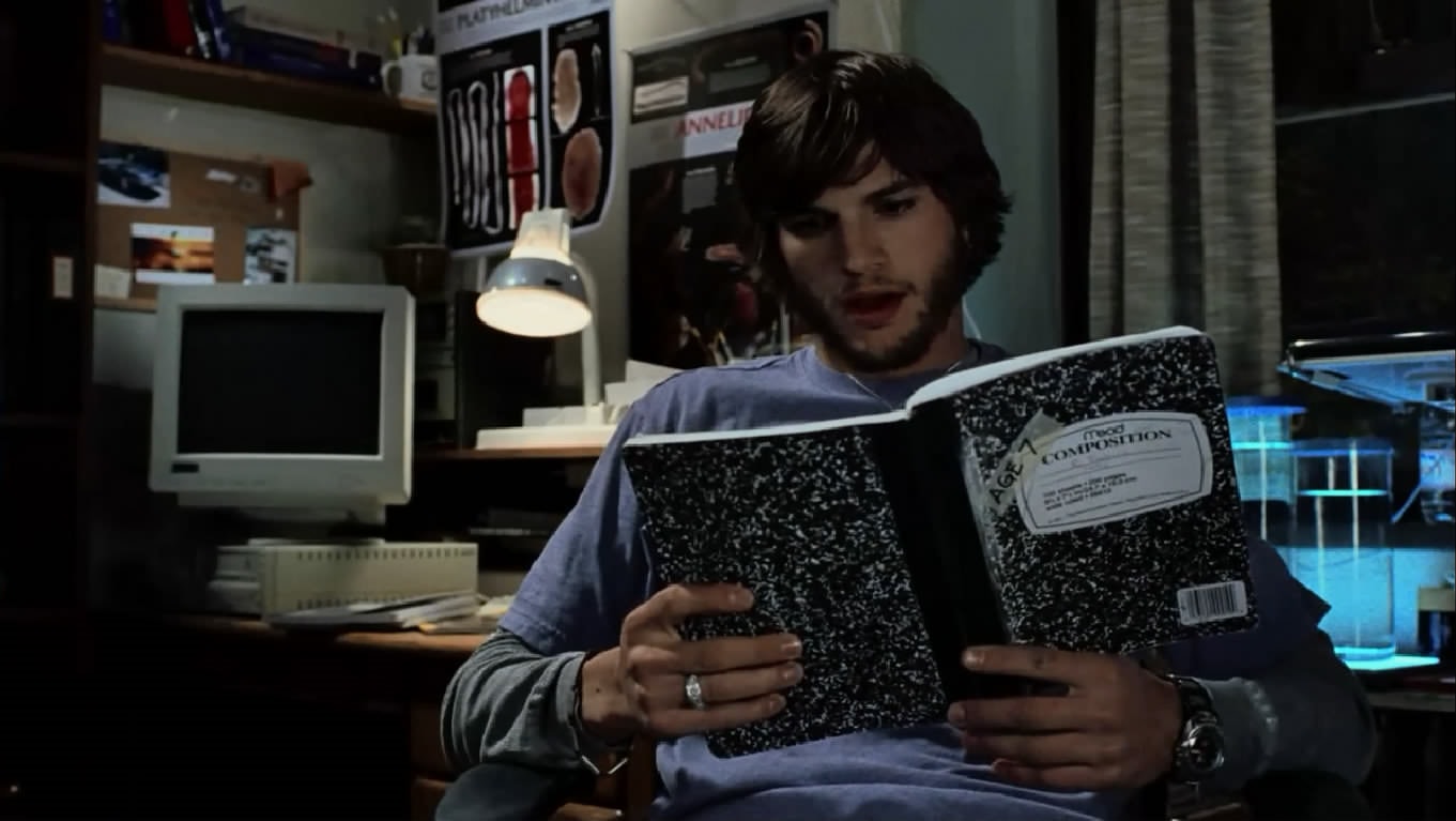 我曾經看過片段的《蝴蝶效應》,2012年時有次到朋友家玩貓時,朋友正在看這部電影,我就邊跟貓玩邊看,沒有很認真看,印象中是從他坐在樹下(這次看發現坐樹下有兩幕)那邊開始看,大概看十來分鐘有吧,多少知道知道主角回到過去做出不同選擇這件事,但由於印象不深刻,這次看還是保有頗為完整的觀賞樂趣。當時電視台即使是深夜也不播限制級的,會播一些比較血腥或情色的,但不會有露點。(最近這個月才在數位機上盒看到有播出限制級電影,透過親子鎖密碼保護。)