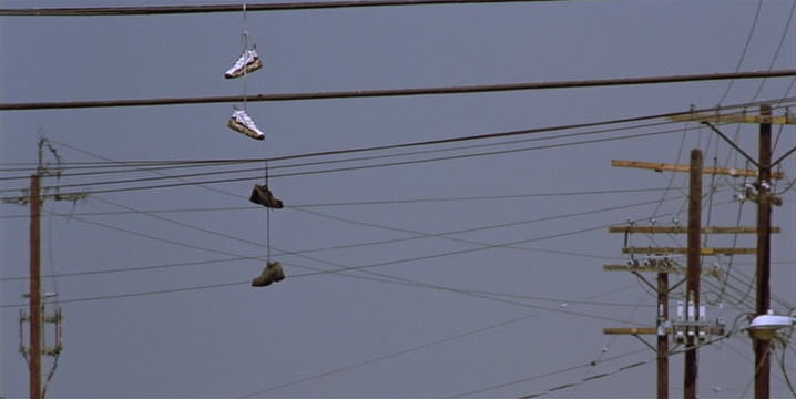 看到這幕時覺得蠻好奇把鞋子掛在電線上是什麼用意,查資料後發現這叫 Shoefiti,這樣做的用意大概有幾種說法:性交易地點、毒品交易地點、黑幫地盤宣示,不過較為普遍的說法還是學生畢業後把鞋子拋到電線上。很多國家都有這種現象。