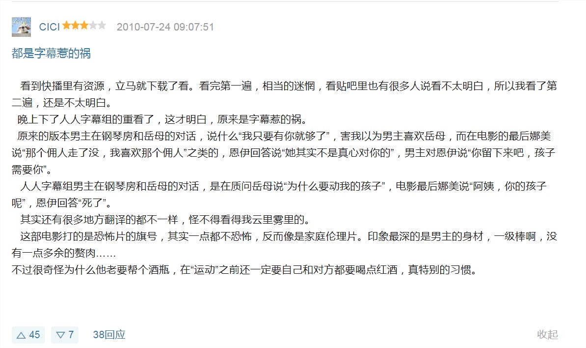 看盜版有個很大的缺點,就是字幕亂翻譯,這在2010年那時品質更是嚴重參差不齊,像這部電影在豆瓣電影網上,就可以看到多數留言者看的版本都是翻譯嚴重錯誤的版本,像是把高勳責問海洛媽媽的片段翻譯成調情,對海洛媽媽的稱謂上也在不同時間點翻成媽跟姊,嚴重影響觀眾理解劇情。