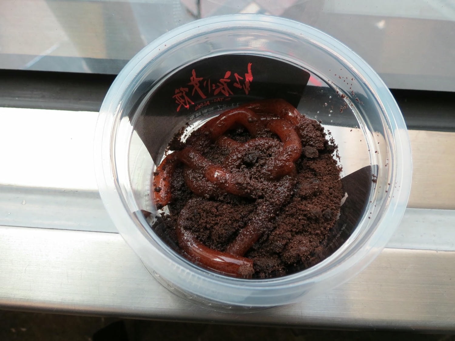 但仔細一看,原來是類似之前「盆栽蛋糕」的偽蚯蚓小點心,蚯蚓是用果凍做的,土壤則是用椰子粉與巧克力之類的東西做成的。