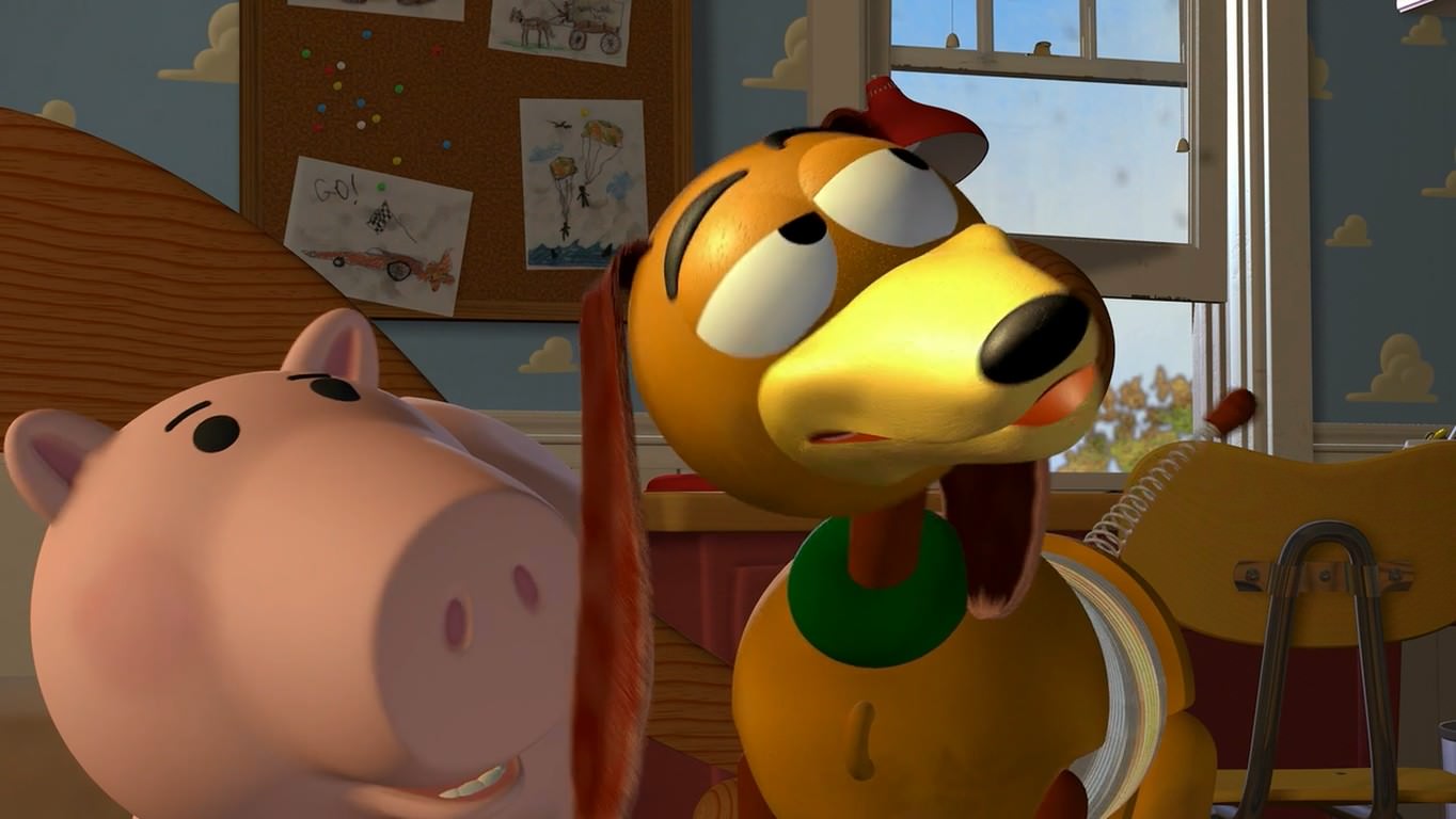 吉姆·凡尼/Jim Varney 為 彈簧狗/Slinky Dog(圖右)配音。