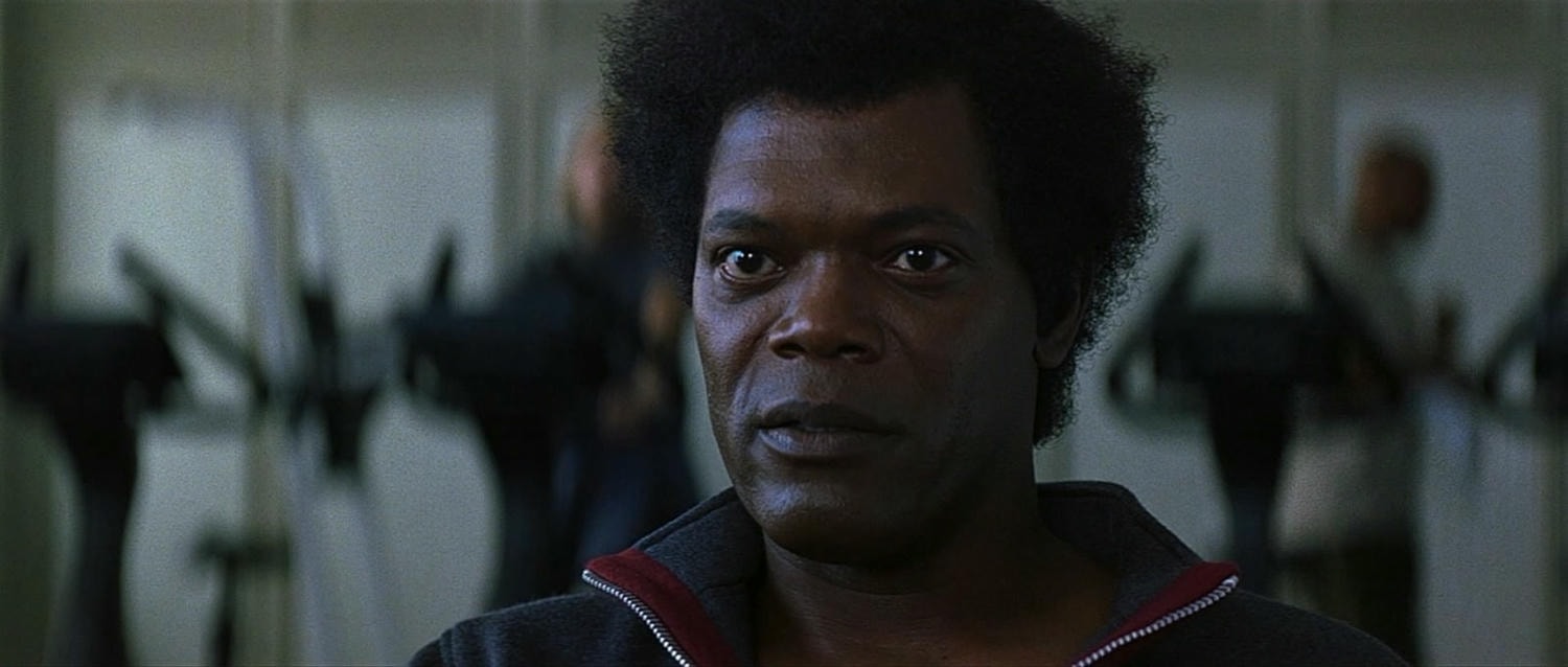 山繆傑克森/Samuel L. Jackson 飾演 普伊萊/Elijah Price,漫畫藝術收藏家,算男配角。山繆傑克森演這部電影時約52歲,看不太出來說。