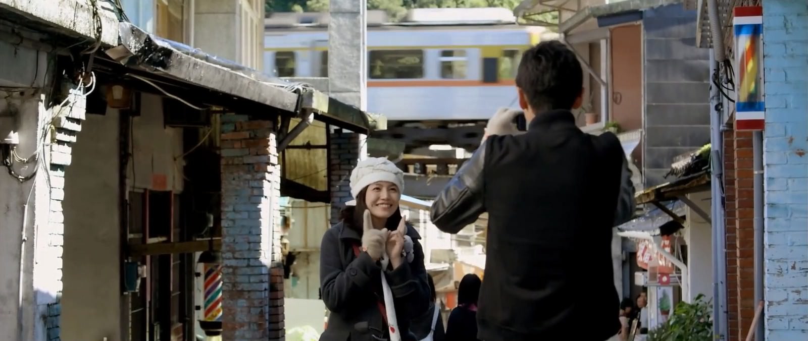 場景:菁桐老街,位置大概在「楊家雞捲」(Google Map),背景的綠色建築是「菁桐礦業生活館」(Google Map)。