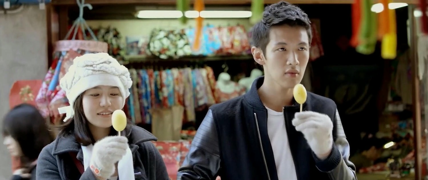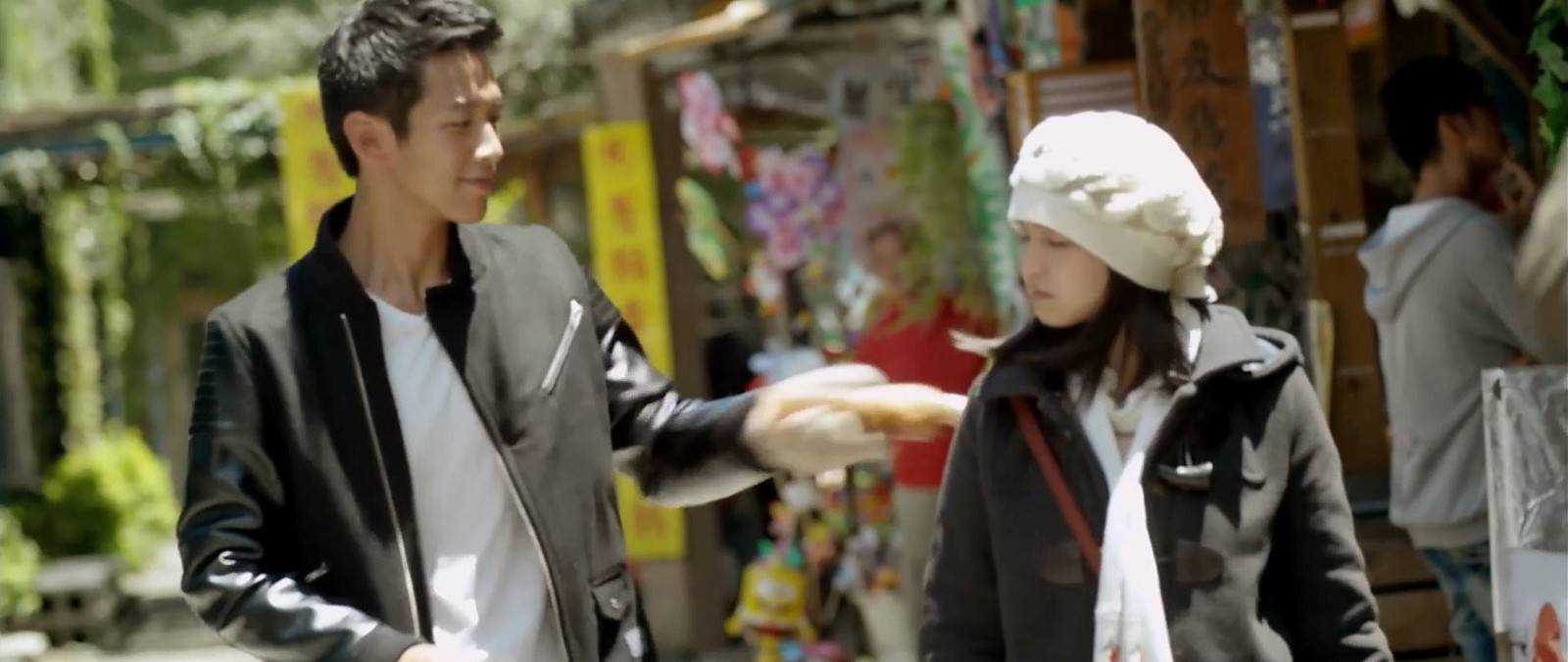 場景:「平溪街」(平溪老街)上,他們吃的東西是「雞蛋冰」,因造型相似雞蛋而得名,冰是在「美雲布藝工作室」(Google Map)買的,背景則是街道對面的「平溪街40號花布店」(鴻昌布莊)。