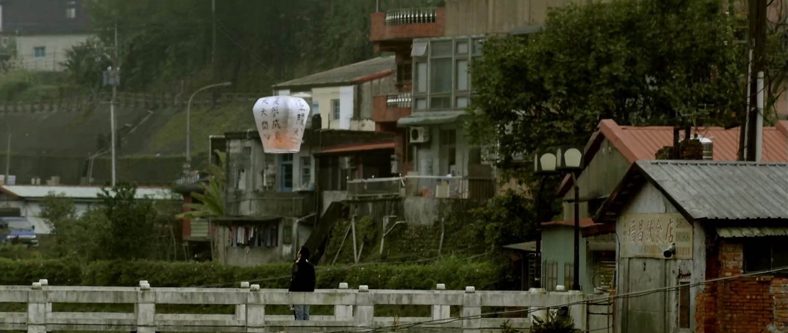 場景:這在「平溪街」(平溪老街)上,這一幕大約是在「平溪客家湯圓」(Google Map)的位置斜坡上方往下方拍攝的,旁邊早期理髮廳的旋轉燈是辨識重點。