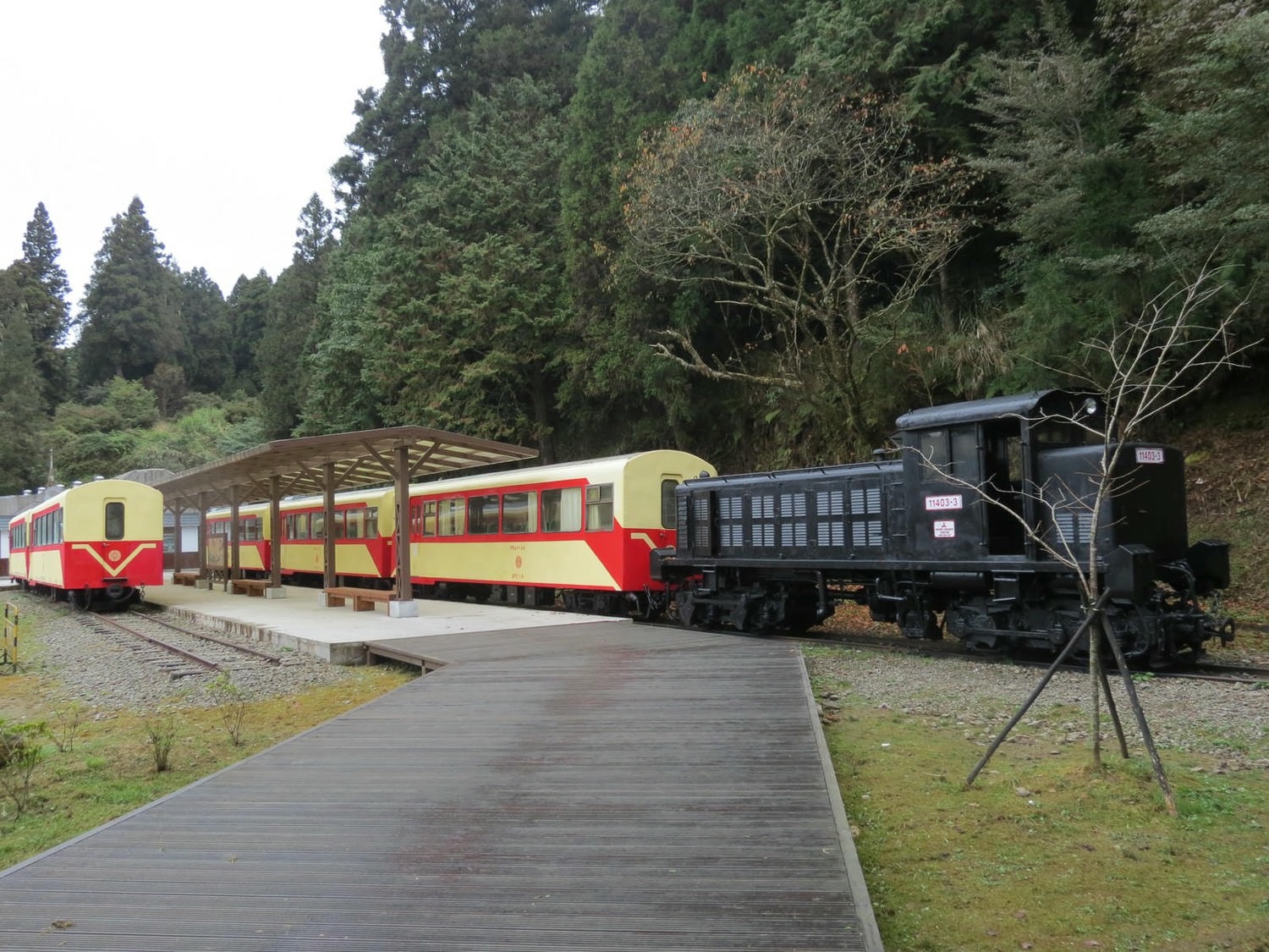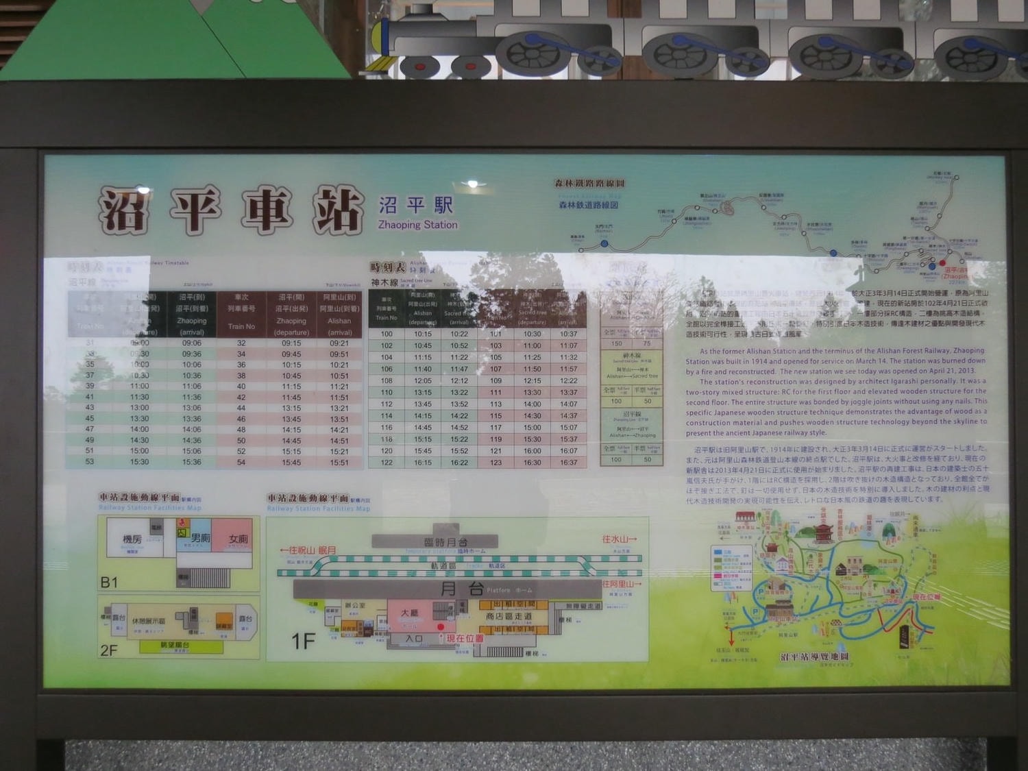 「阿里山車站(新站)」在2007年重建完畢,就是現在看到的木造建築。沼平車站則是於2013年整修後重新啟用。